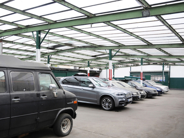Mietshaus mit Tiefgarage, Werkstatt, Autosalon und Tankstelle